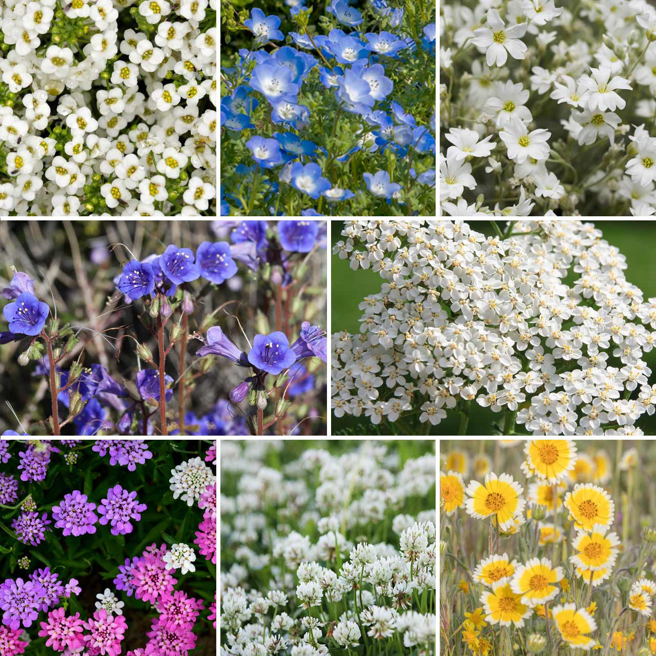 White Yarrow, Baby’s Breath, Candytuft, Tidy Tips, Alyssum, Baby Blue Eyes, California Bluebells, White Dutch Clover. Mix contains 50% annual, 50% perennial flower seeds.