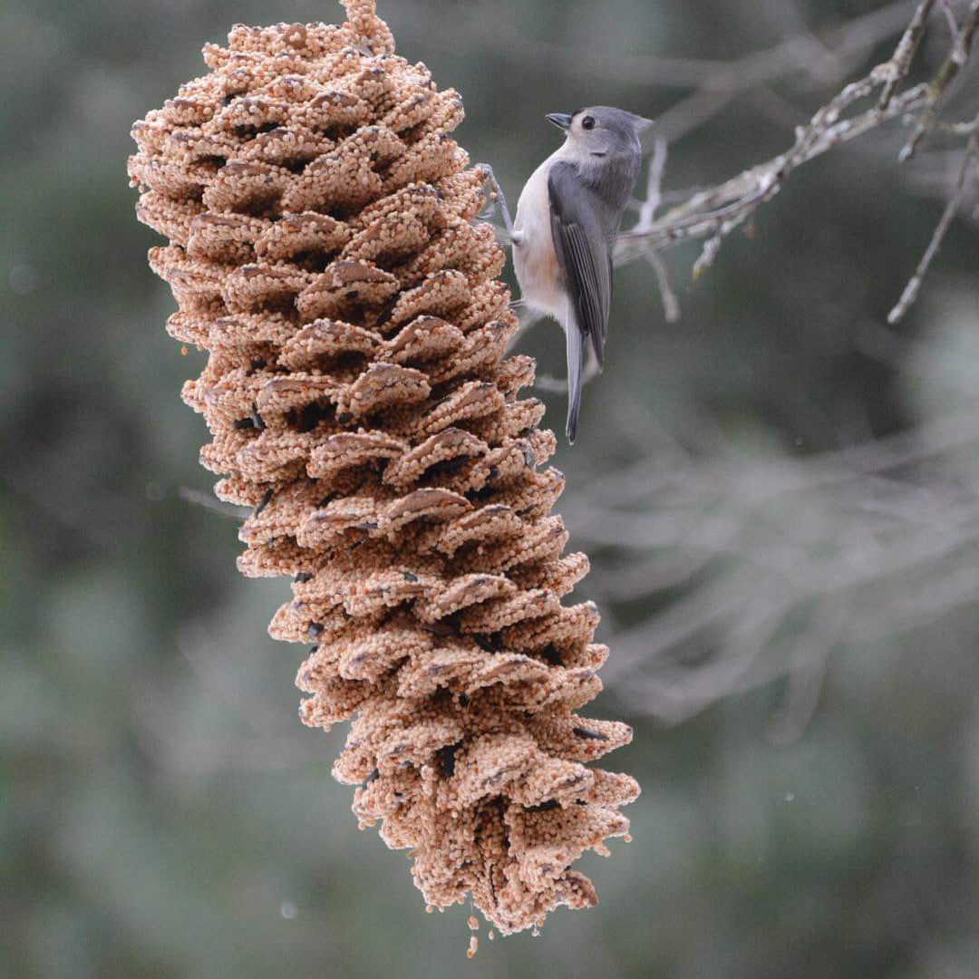 Bring natural beauty to your backyard with this large, hand-gathered sugar pine cone from the forests of Oregon. Each cone measuring 9-12 inches, is generously coated with premium bird seed to attract a variety of feathered friends.