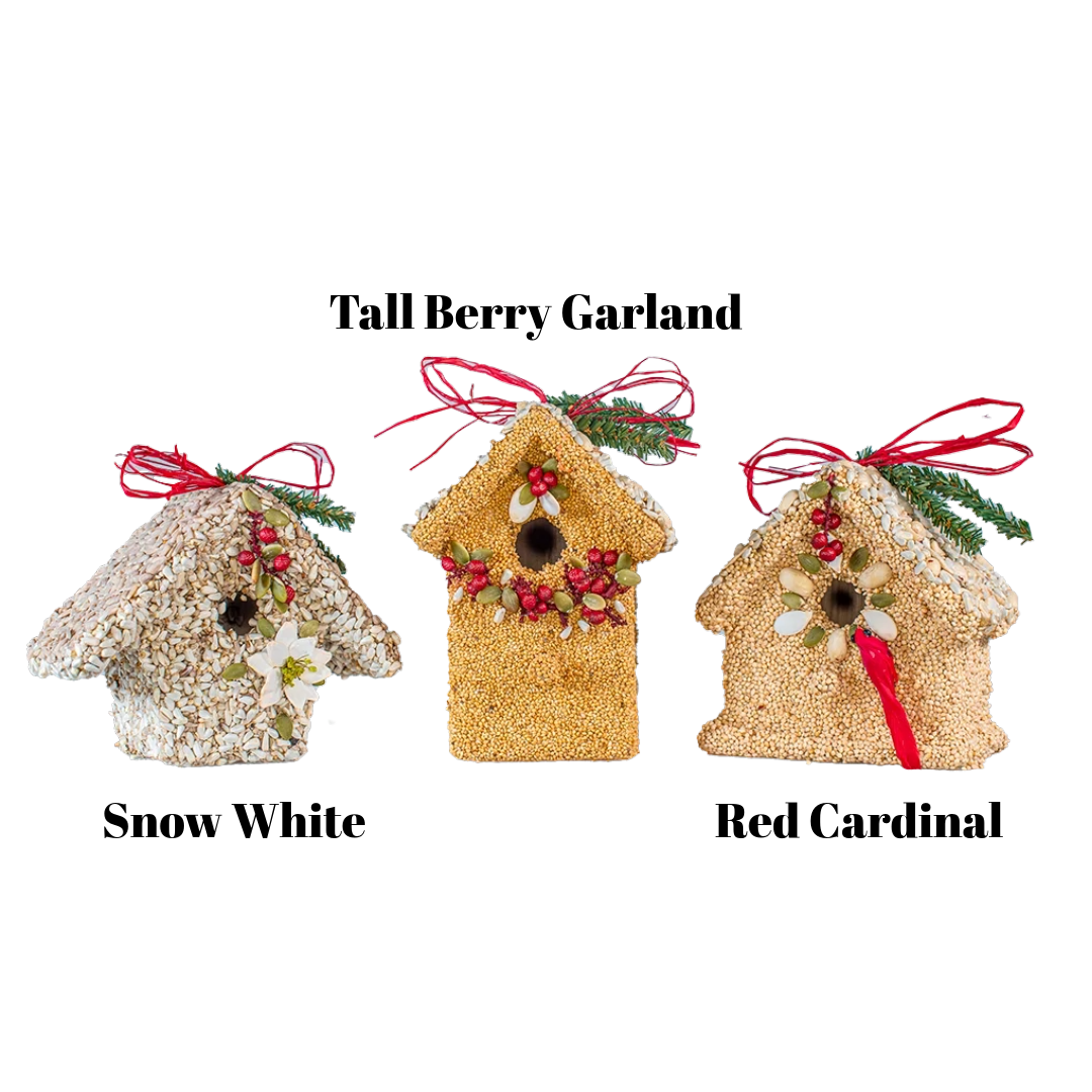 The perfect poinsettia perches for your favorite feathered friends! These three elegant cottages are hand decorated with millet, safflower, sunflower hearts, pumpkin seed, pepitas, dried florals, and cardinals. Choose from three assorted styles.