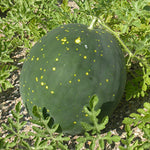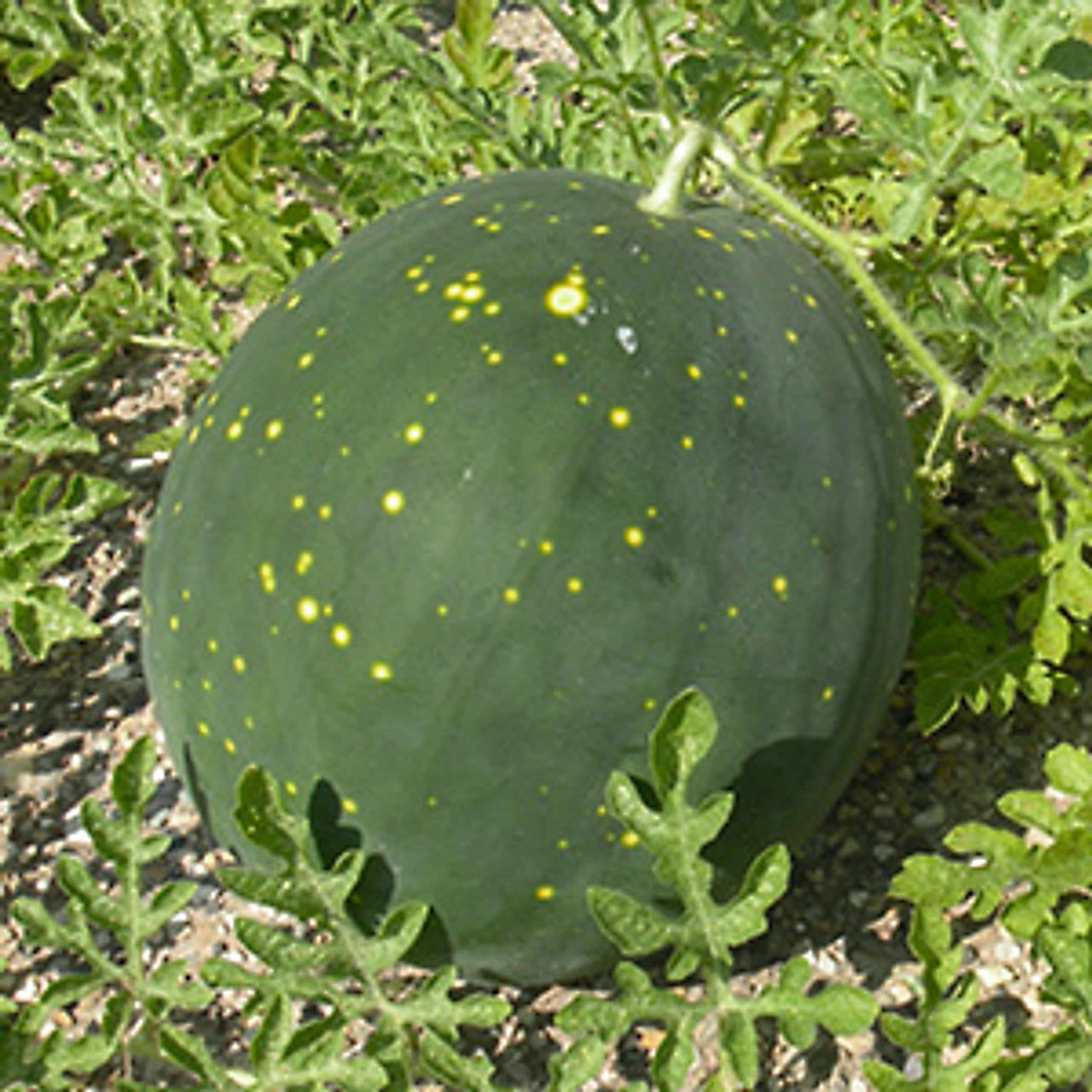 This large, American heirloom has a dark green rind speckled with yellow dots. Originally released in 1926, Moon and Stars Red Watermelon was lost for several decades before being rediscovered in 1981. Round fruits are intensely sweet.