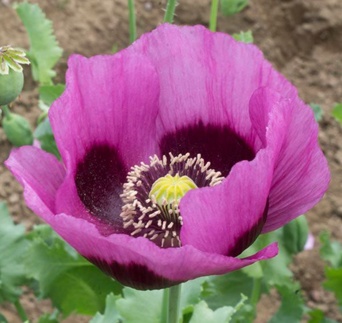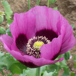 This unique Swiss variety, originally developed for poppy seed oil production, brings both charm and rarity to your garden. Each flower is adorned with bold, deep eggplant-colored markings at the center, creating an elegant contrast. The waxy, scalloped, gray-green leaves provide the perfect backdrop to highlight the vivid blooms. 3-4’ tall at full maturity.