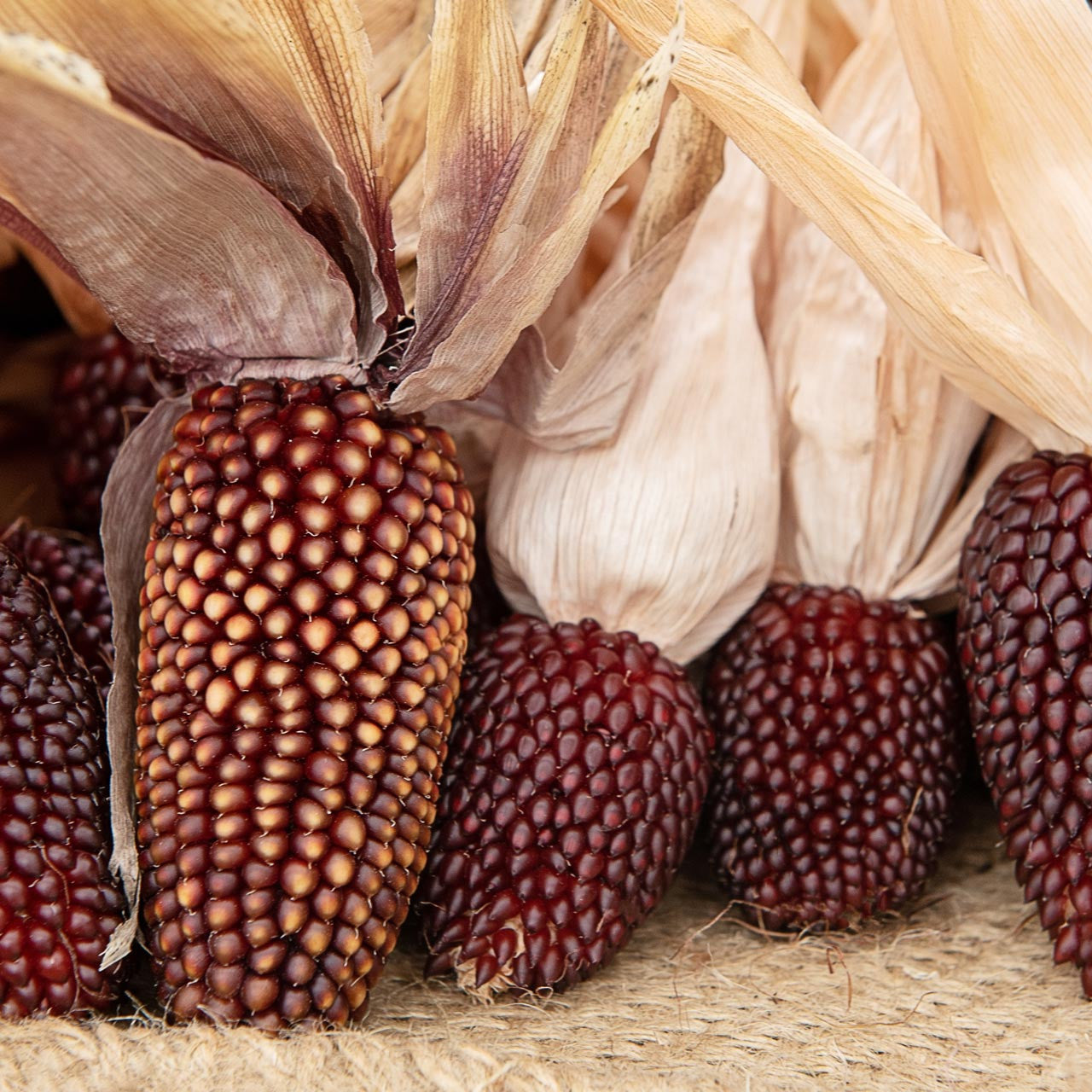 Small stalks reaching only 4' tall yield 2-4 ruby-colored mini-ears, 2-3” in length. A gorgeous fall ornamental that is delicious when popped - light, fluffy kernels are tender and tasty. Easy and fun to grow.