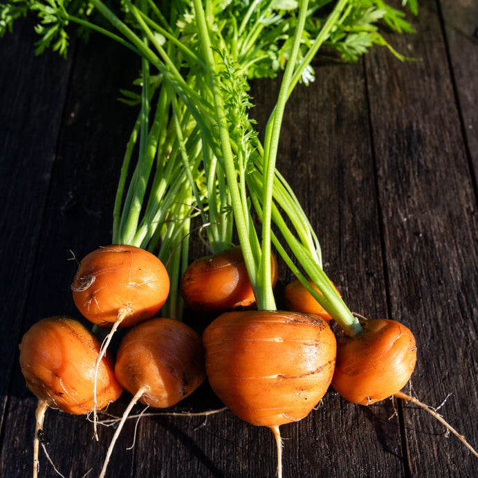 These round, whimsical carrots make for a fun, bite-sized treat! Reaching roughly an inch in diameter, this French variety tastes crunchy and sweet. The perfect choice for container gardens or denser soil.