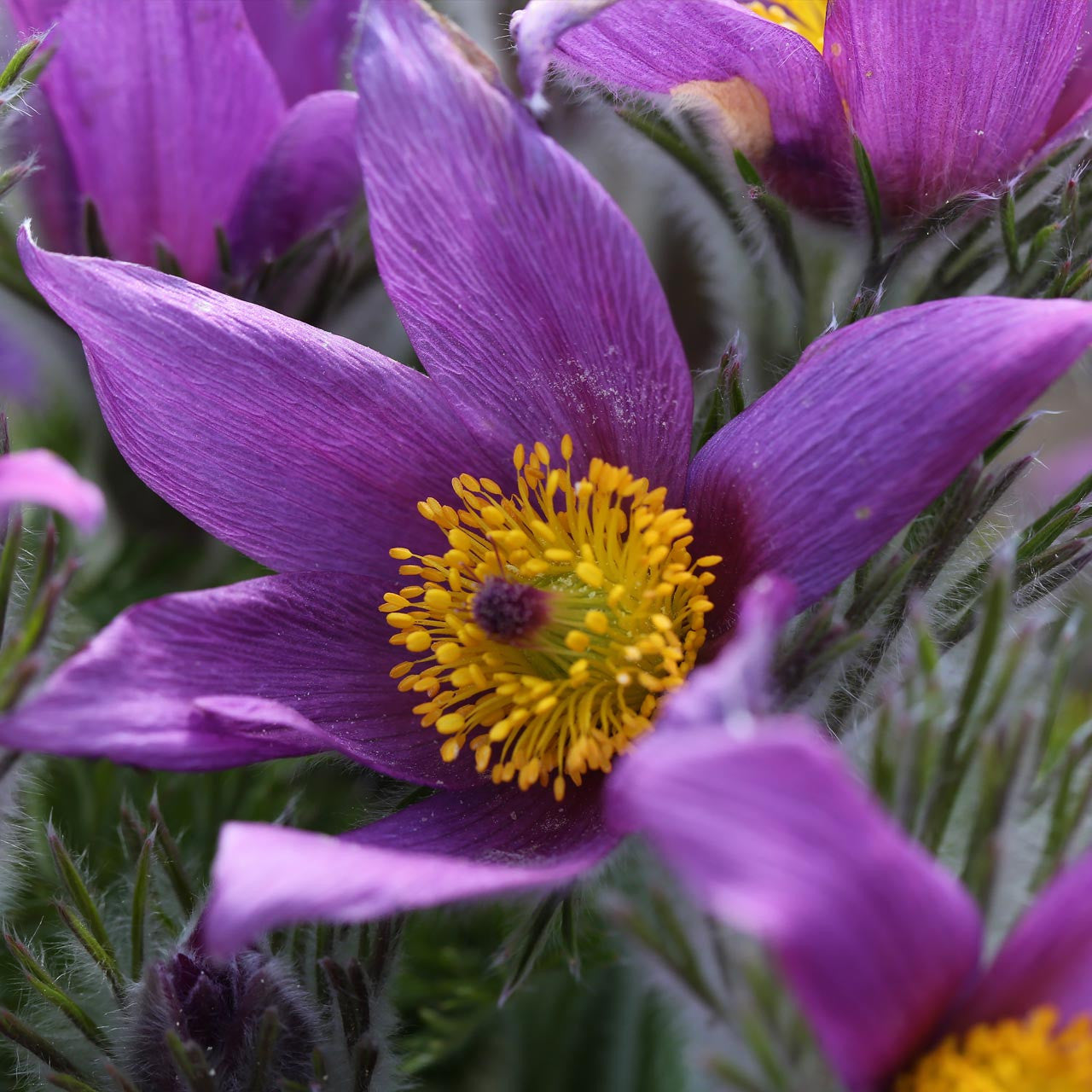 Cold hardy Pasque Flower, also known as Prairie Crocus, blooms in early spring around Easter. This low-growing wildflower yields copious purple blossoms with brilliant yellow centers once established a year or so after planting. Thrives in sandy, rocky soil. Valued as a medicinal flower.