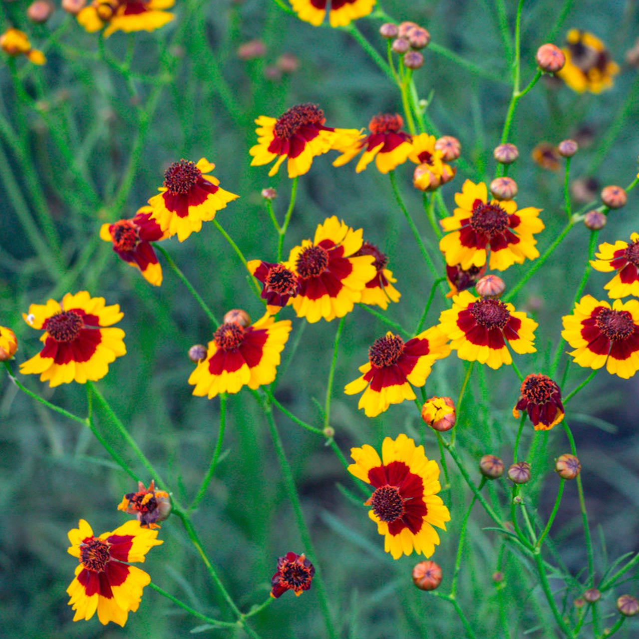 Sporting intense yellow blossoms with deep red-bronze centers, this tough American native produces masses of flowers in almost any soil type. Drought tolerance and deer/rabbit resistance make this flinty variety perfect for challenging growing areas. Loved by bees and butterflies alike, Plains Coreopsis creates a welcome refuge for beneficials and pollinators.