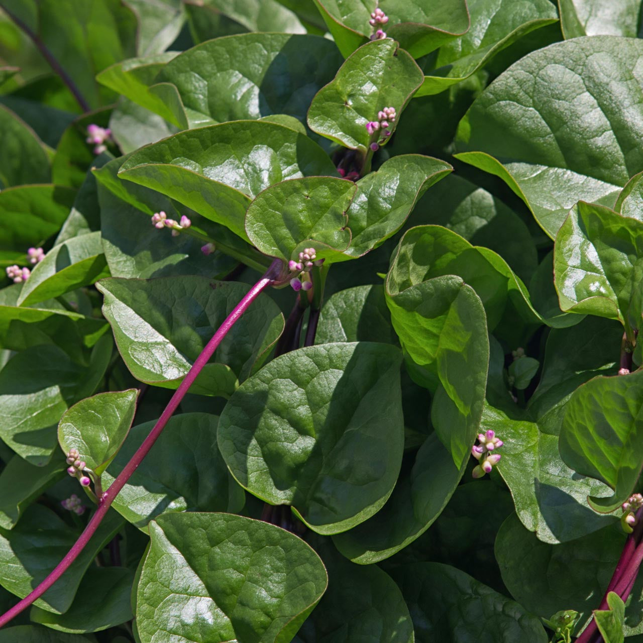 This beautiful Asian heirloom is a green, not a true spinach! Red Malabar’s rambling red vines are covered with glossy green leaves that are tender and delicious in summer juices, salads, sandwiches, stir-fries, and wraps. Purply black berries are often used as a natural dye. Vines reach 8-10’ long. Support is required.