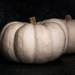 A stunning, medium-sized white pumpkin – ornamental and delicious. Very dense yellow flesh is great for pies and as a baking ingredient. Average fruit size is 11-15” in diameter; 6-8” tall; 10-15 lbs. Vines may reach 10’ in length.