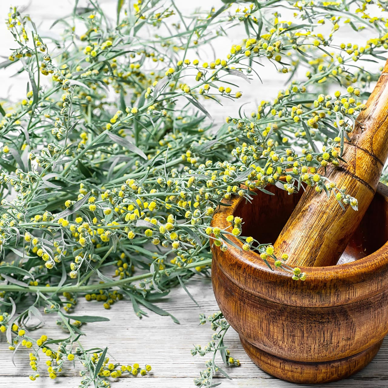 This woody, highly aromatic perennial with feathery, silver-green leaves and tiny yellow blossoms is often used as an ornamental plant. Wormwood is valued as a medicinal herb. Leaves, stems, and flowers are used to make tinctures and the liqueur, Absinthe. Plants grow to 3’ tall. Drought tolerant.