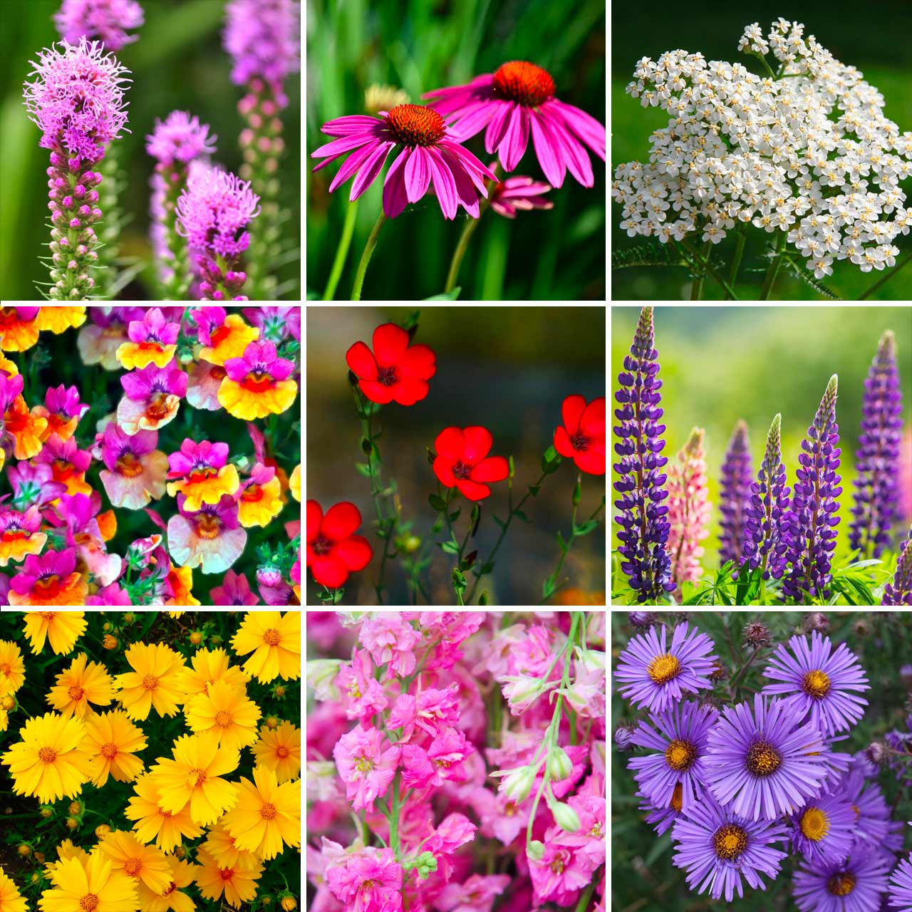 American Legion Poppy, Baby’s Breath (annual), Black Eyed Susan, Catchfly, Cornflower, Evening Primrose, Gaillardia (perennial), Gayfeather/Spiked Blazing Star, Lance-Leaf Coreopsis, New England Aster, Perennial Lupine, Purple Coneflower, Rocket Larkspur, Scarlet Flax, Siberian Wallflower, Spurred Snapdragon, Sweet William, and White Yarrow. Mix contains 45% annual, 48% perennial, and 7% biennial flower seeds.