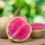Also known as Red Meat Radish, this colorful heirloom has a white body (3” in diameter), green shoulders, and bright pinky-red flesh. Sweet, mild flavor and a crunchy, firm texture delicious fresh from the garden and quick-pickled.